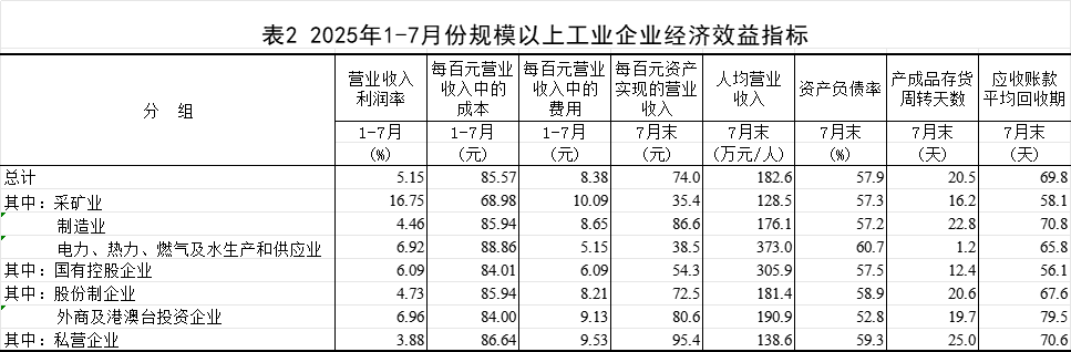 1—7月份,規(guī)模以上工業(yè)企業(yè)實(shí)現(xiàn)營(yíng)業(yè)收入78.07萬(wàn)億元,同比增長(zhǎng)2.3%;發(fā)生營(yíng)業(yè)成本66.80萬(wàn)億元,增長(zhǎng)2.5%;營(yíng)業(yè)收入利潤(rùn)率為5.15%,同比下降0.21個(gè)百分點(diǎn)。